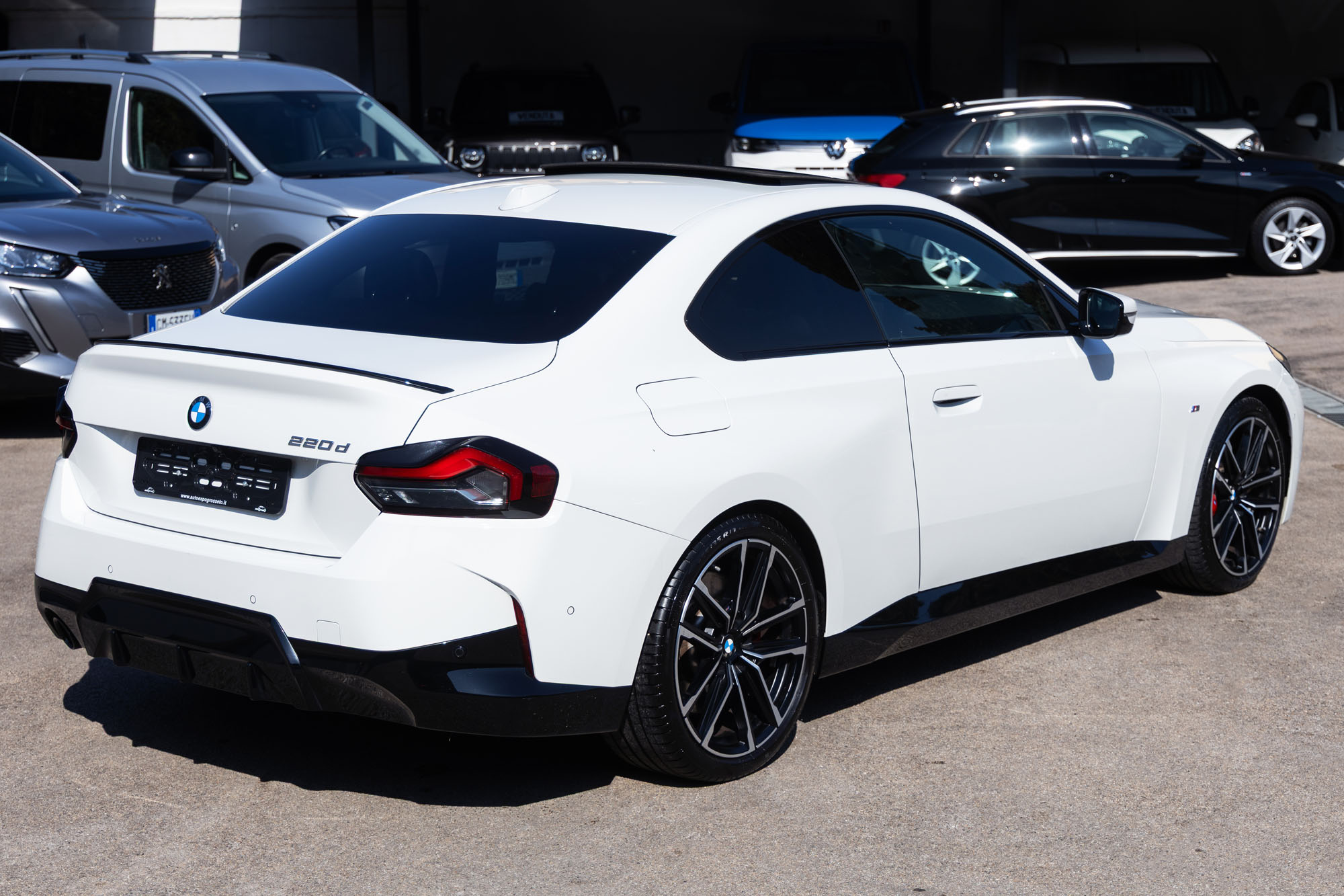 Bmw 220d coupè 190cv steptronic, allestimento Msport, anno 2023, km 68900, cerchi lega diamantati da 19" M sport, sensori anteriori e posteriori con telecamera a 360°, chiave confort, fari full led adattivi, vetri posteriori e lunotto oscurati, tetto in vetro apribile, volante in pelle multifunzione con palette riscaldabile, interni in pelle totale nera, sedili anteriori a regolabili elettricamente con memorie, sedili anteriori riscaldabili, radionavigatore con car play e android auto, sistema audio harman kardon, impianto frenante M sport con pinze rosse, ambient light.